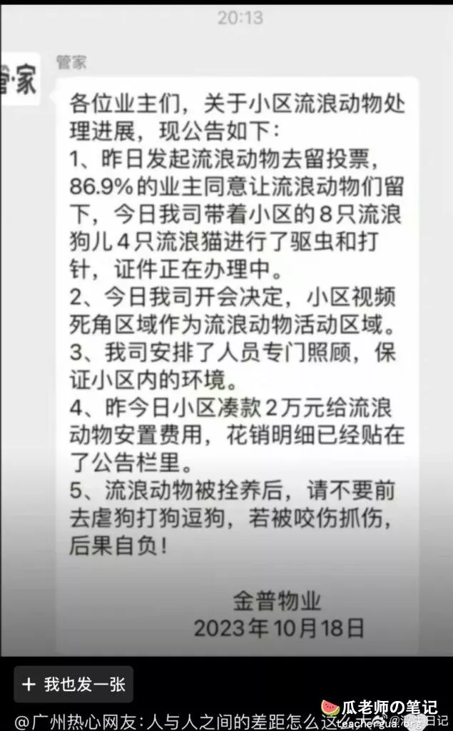 在全国掀起群体暴力猫狗的运动的同时,一些小区也通过民主投票的方式决定了小区内流浪动物的去留,和对动物们的人道关怀和处理方式。事实证明流浪动物治理不是做不好,一刀切就是纯粹懒政。