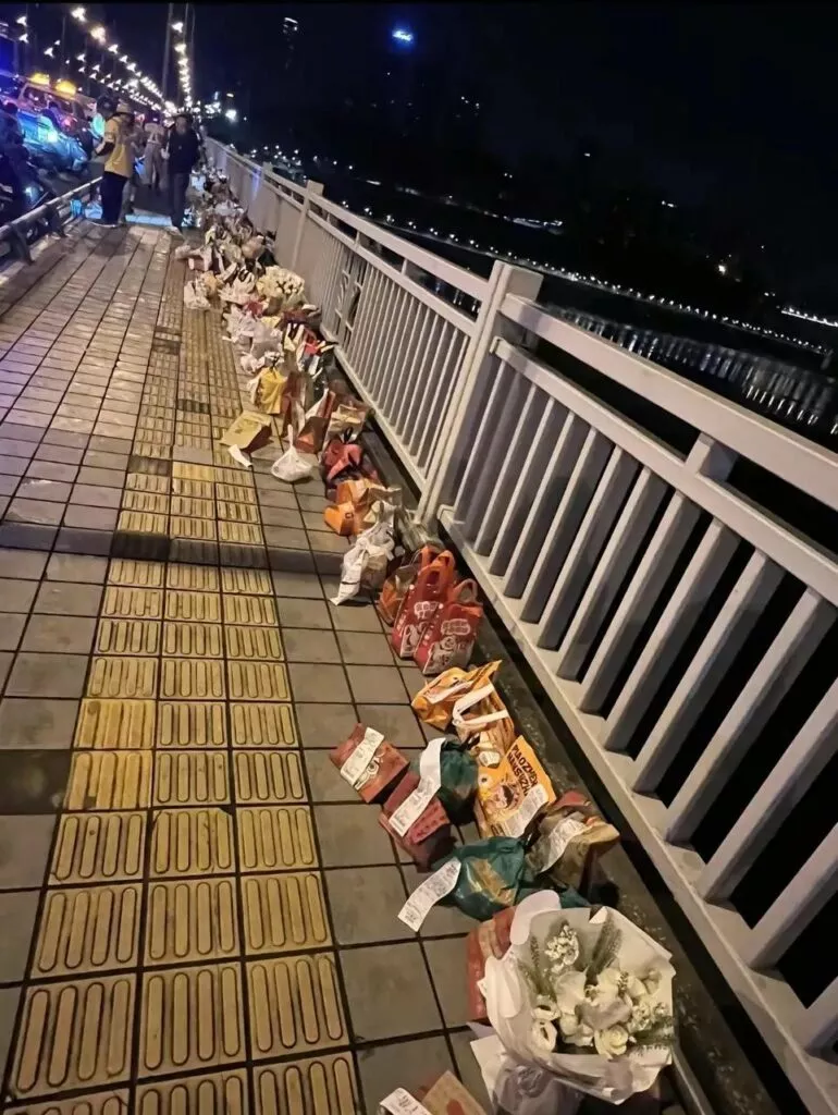 因为这件事,纯爱战士被大家祭奠。下面的大桥上铺满了鲜花!
